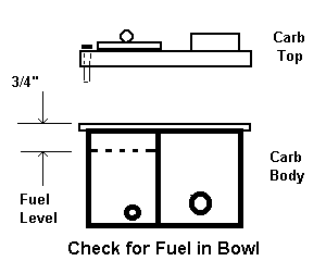 Take the top of the carb off (5 screws). Take care not to damage the gasket or lose tiny parts. The level of the fuel should be roughly 3/4" below the rim of the bowl.