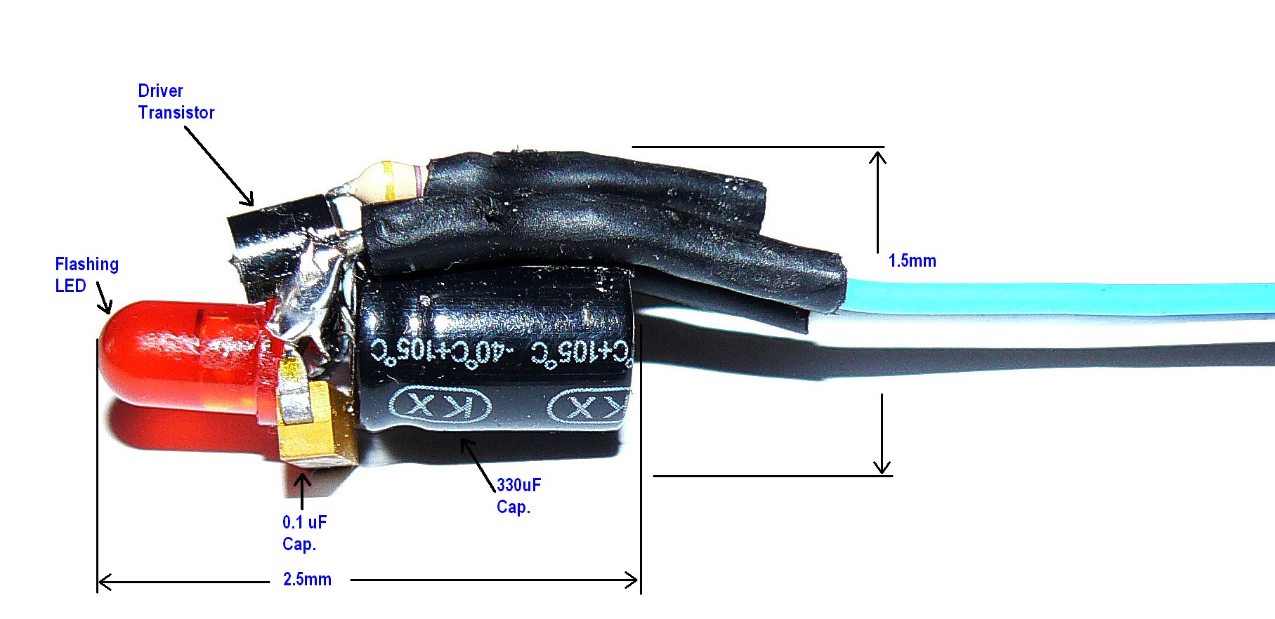 The circuit is easy to build and assembly is not critical. I squeezed the parts into a tubular housing with the LED poking out one end: