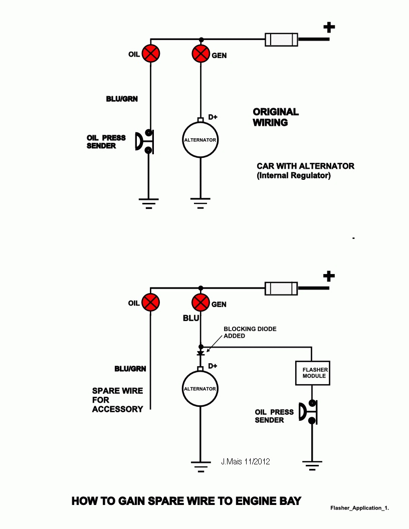 The flasher might be used for this purpose. The following applies to Type 1 cars with an alternator with internal regulator and to Type 2 vans with any alternator. The flasher module is wired in the OIL sender circuit. The alternator D+ Lead is connected to the same bulb with a small diode inserted in the lead to block reverse current.