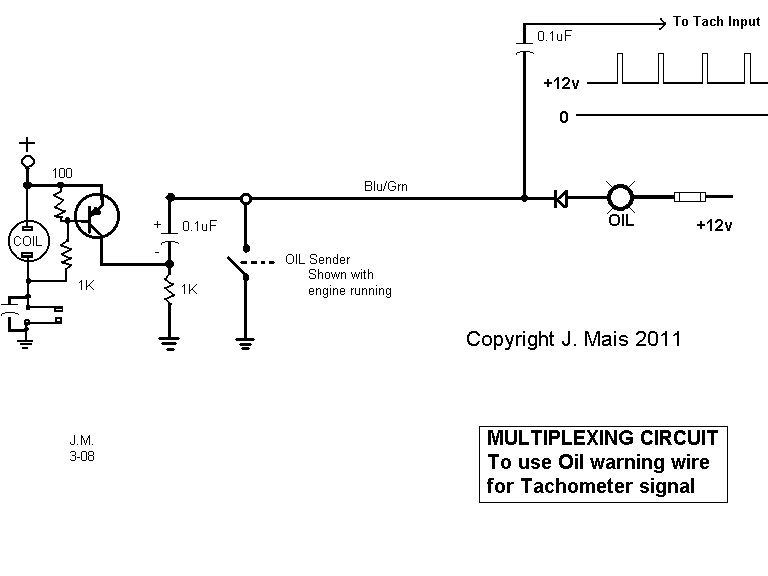 When the engine is running, the Blu/Grn OIL sender wire has +12V on it because the sender contact is OPEN. Suppose that we could force the voltage on that wire to go up to almost double the 12V every time that the points close. Then, at the dash end, retrieve those pulses without affecting the OIL warning light.