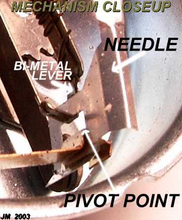 needle is attached. The bi-metal lever has a "hook" which pushes or pulls
