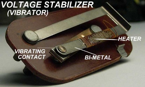 Because of the sensitivity of the heater/bi-metal design, it is very important that the input voltage to the gauge be constant. Voltage regulation is accomplished by a very simple, yet effective, design. Shown below are the exterior and interior views of the voltage stabilizer or "vibrator", as it is often called.
