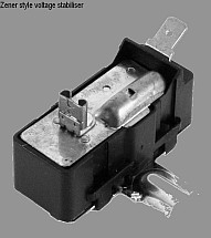 Whether driven by cost or reliability I don't know, but the vibrator stabiliser has been replaced by a Zener diode shunt regulator design. 12V input is fed thru a series resistance in the form of a small incandescent lamp to a 5.2V Zener diode. The lamp provides some regulation in itself since incandescent filaments vary in resistance dramatically as they heat up. If the 12V supply increases (as when battery is charging), the lamp gets slightly brighter and its resistance goes up, decreasing the output voltage. The Zener then performs the remainder of fine regulation required.