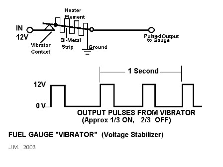 The closer the pulses are together or of longer duration, the hotter the heater in the gauge will get. By accurately controlling the pulses, the stabilizer has the effect of regulating the voltage (here, we're talking about RMS or "effective" voltage). Suppose that battery voltage goes up (as when the generator increases output). The heater in the stabilizer will heat up more rapidly and open the contact points sooner. The result will be shorter pulses of 12V sent to the gauge. The opposite happens when the battery voltage goes lower.