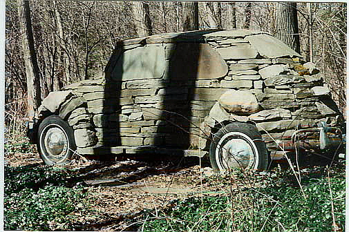The whole episode of the construction of the Stone VW is revealed by the owner in a book titled simply "My Bug". The editor, Michael J. Rosen, has collected the stories of dozens of VW owners. Stephen Gibian was the builder and the year was 1976. There was a rusted hulk of a 60's Beetle in the field and, nearby, the remains of a stone foundation. Put them together, and...voila! The book has additional photos of the construction stages as well as descriptive text, e.g.: "The windows were slabs of stone found at a local quarry..."
